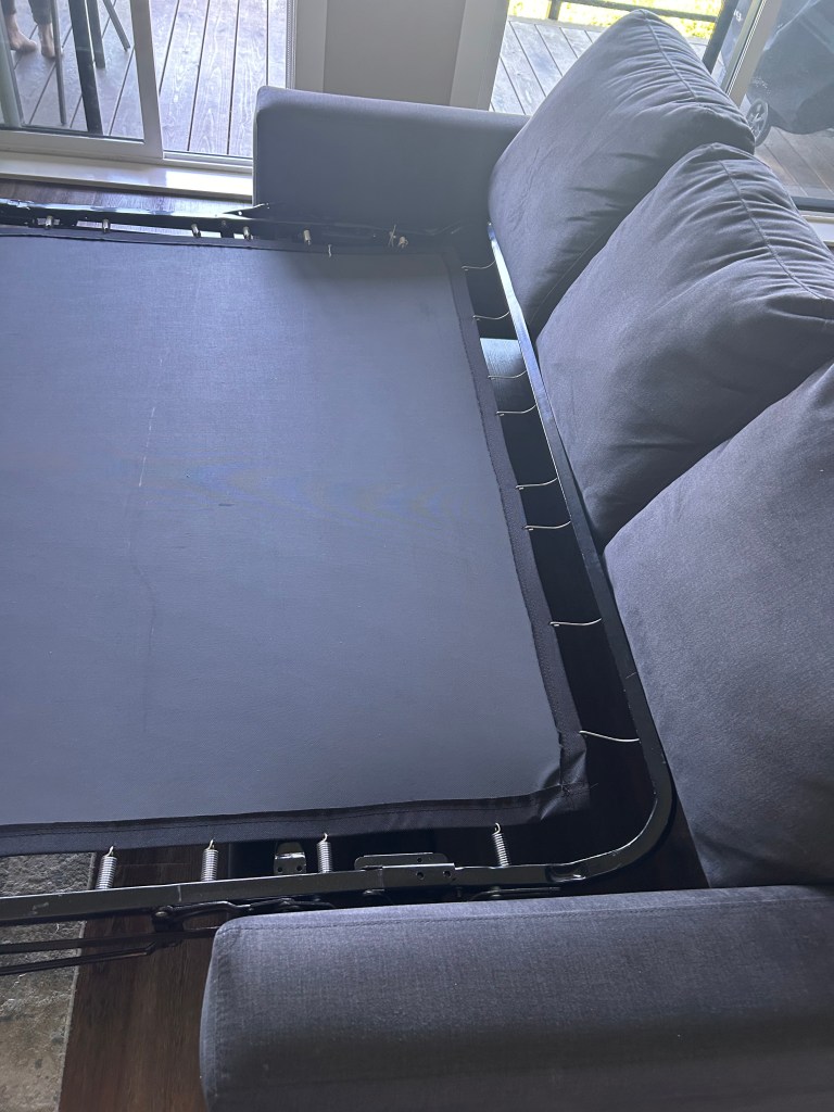 The pullout couch in the living room is new. The mechanism has a pillow support. Please ensure that this is folded flat before attempting to close the couch and please do not sit on the frame when it is lifted up.
